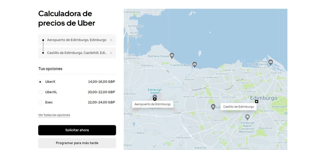 Para redactar este artículo hemos hecho varias búsquedas de prueba y hemos visto que, por ejemplo, ir del aeropuerto de Edimburgo a la zona del Castillo cuesta entre 16,30€ y 27,95€ (14£ y 24£). Y al Museo Nacional de Escocia entre 17,50€-29€ (15£-25£). Puedes hacerte una idea de cuánto puede costarte la carrera a tu alojamiento con la calculadora de precios de Uber.